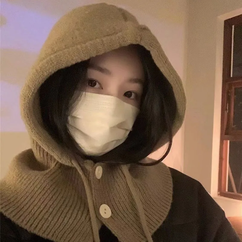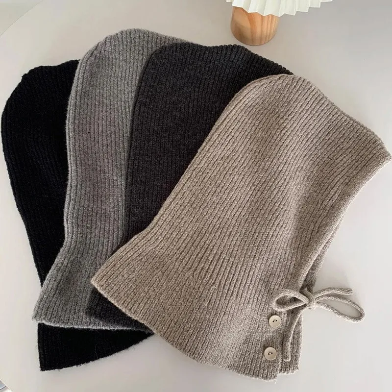 Winter Balaclava Hats For Women Knitted Hooded Caps Solid Color Outdoor Warmer Drawstring Hat One-Piece Neck Collar Beanies Caps